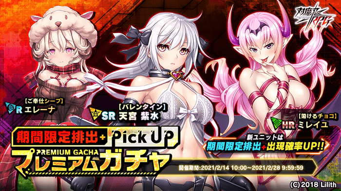 期間中は新規キャラクター「『【バレンタイン】天宮 紫水』『【蕩けるチョコ】ミレイユ』『【ご奉仕シープ】エレーナ』の出現確率がアップしております。