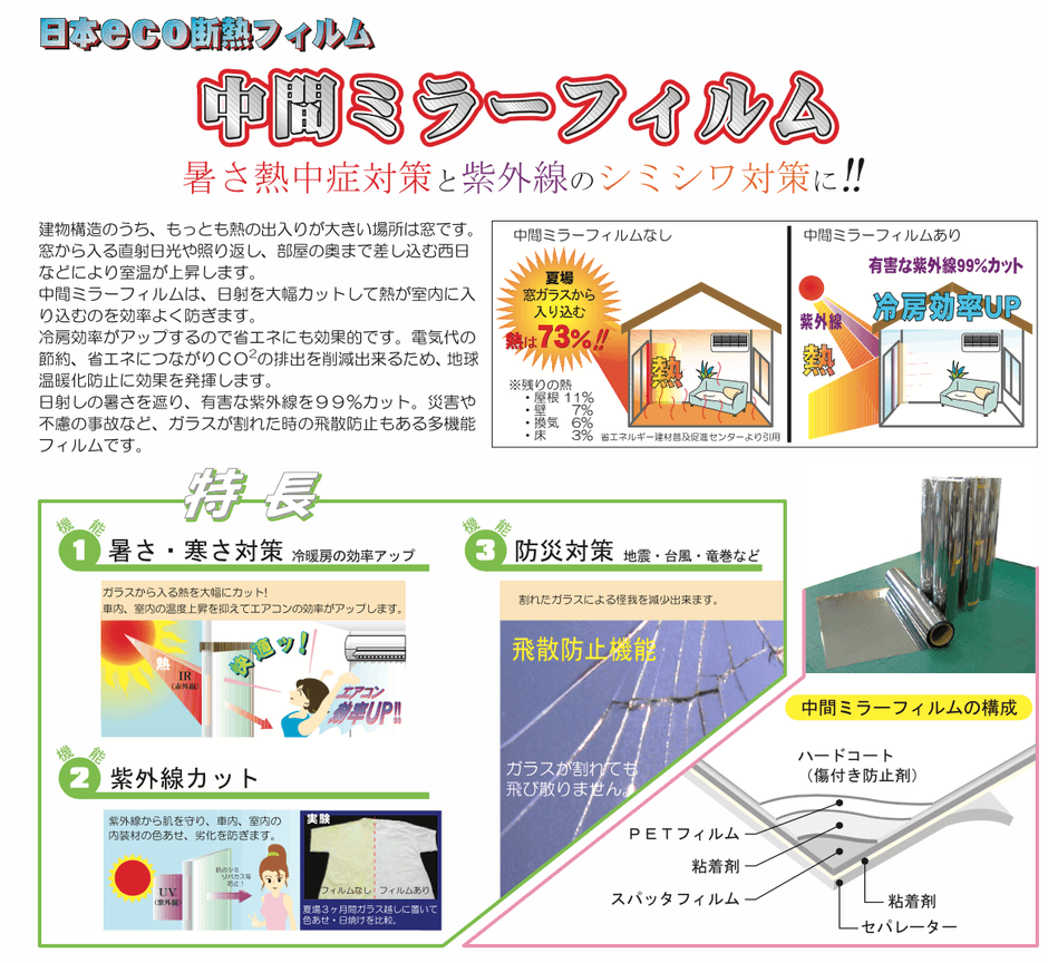 当社の『UVカットハーフミラー窓シート』は、半導体にも使われるスパッタリング製造でアルミ金属膜を均一にする事に成功して耐久性を長くしました。また誰でも貼れるようにカンタン工具を開発したり、カッターやハサミなどで切ることができます。またガラスが割れても粘着する飛散防止効果も付いているので、防犯や地震対策にもなります。耐久性も15年なのに1,000円~と安価に設定しています。