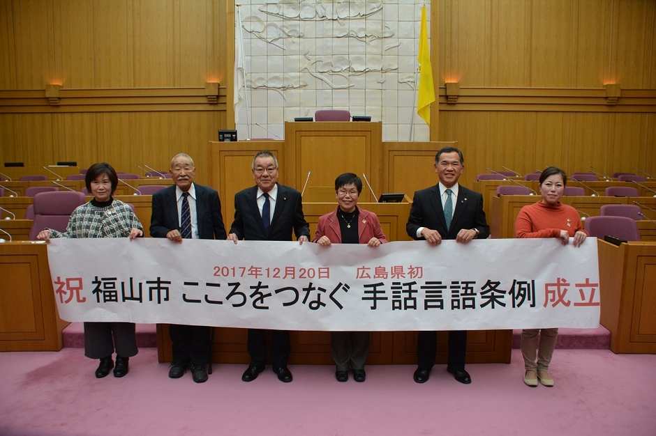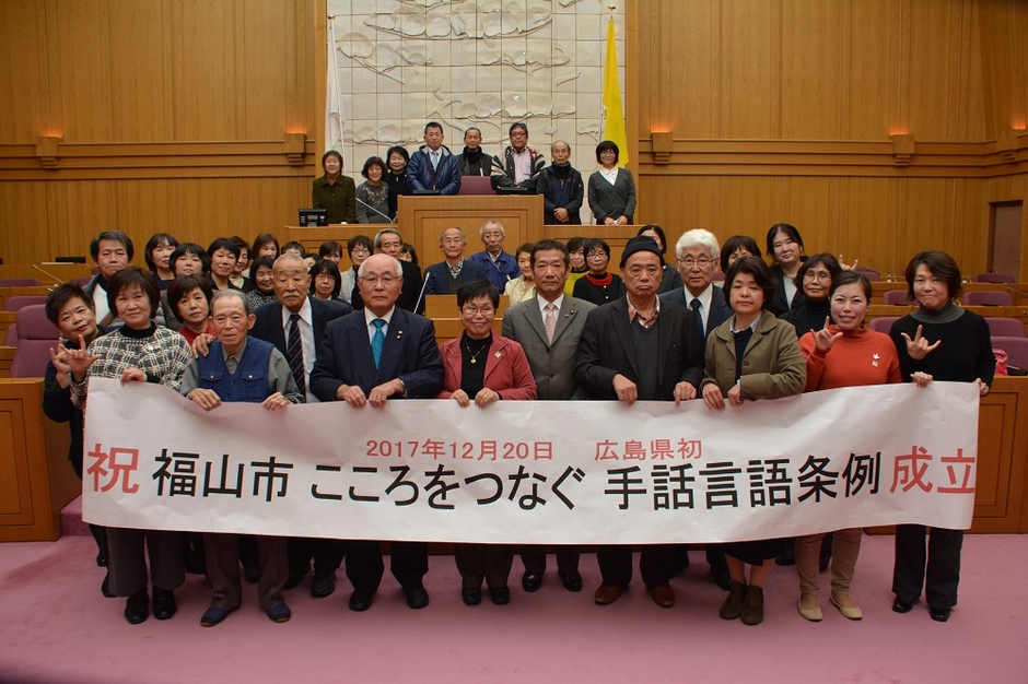 福山市は、広島県内初の手話言語条例(福山市こころをつなぐ手話言語条例)を2017年(平成29年)12月20日に制定しました。