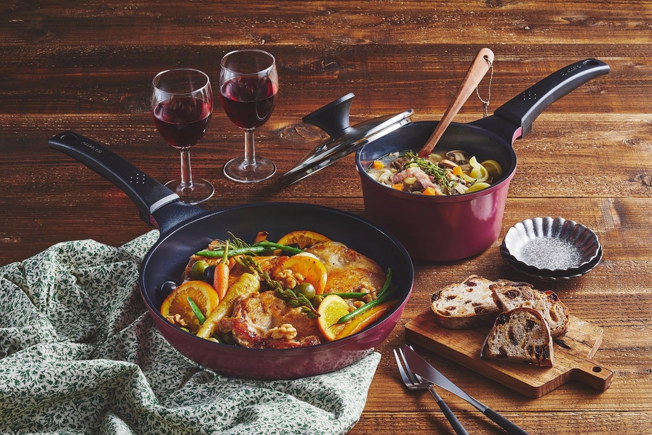 このたびの新シリーズは、秋冬をイメージした深みのあるボルドーカラーを採用し、上質でスタイリッシュなデザインに仕上げました。定番人気のセラブリッド フライパンやセラミックナイフをはじめ、用途に応じて使い分けしやすい「セラブリッド ソースパン&フライパンセット」、セラミックナイフ、ピーラー、まな板がセットになった贈り物にも最適な「セラミックキッチン3点セット」など、豊富なラインアップをご用意しております。