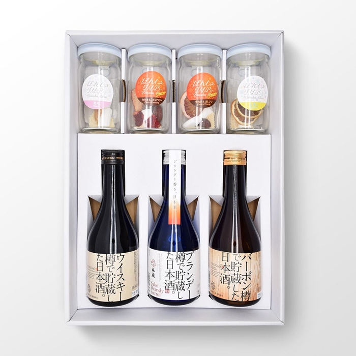 それぞれ、本物のそれぞれの洋酒が仕込まれた樽を海外から直輸入。新潟県三条市の福顔酒造で作られた日本酒をじっくり貯蔵し、樽から本物の香りが染込んだ香り高い日本酒ができました。