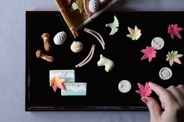 屋形舟の中では抹茶とともに、季節をかたどった和菓子でお盆の上に情景を描く盆景菓子を味わいます。当館の紋をかたどった落雁のほか、モミジ、イチョウ、松葉や猪といった色とりどりの和菓子で、屋形舟から眺める一期一会の景色をお盆の上に描きます。和菓子は1803年創業の和菓子店「亀屋良長」がこのアクティビティのために作ったものです。抹茶は京都・宇治の茶舗「利招園(りしょうえん)茶舗」が、当館のために茶葉を厳選し、挽いたものです。茶の一服が旅の「記録」になるようにとの思いと、大堰川の澄んだみどり色にちなみ、「録碧(ろくへき)」と名付けられています。野点籠を使って自分で抹茶を点てることで、旅の思い出を深めることができます。