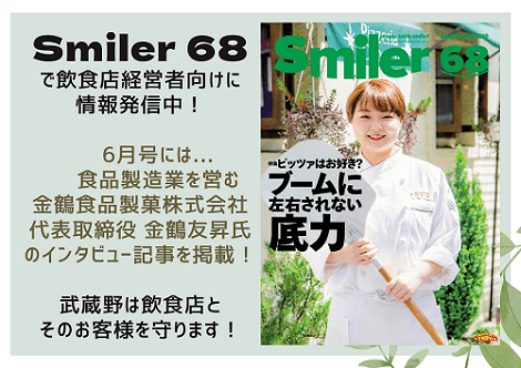 株式会社武蔵野(本社:東京都小金井市、代表取締役社長:小山 昇)はコロナ禍で悩む飲食店オーナーを応援するべく、「Smiler」vol.65(3月発行)から全6回にわたり、“食”にまつわる各業界経営者のインタビュー記事を掲載しています。今号vol.68は6月20日に発行され、食品製造業を営む金鶴食品製菓株式会社 代表取締役 金鶴友昇氏へのインタビュー記事を掲載しました。食品製造工場と次亜塩素酸水の関係性、感染対策にかかるコスト問題、ウィズコロナ時代の戦い方についてなど、多くを語ってもらいました。