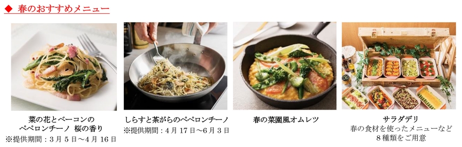 桜の香りとベーコンの旨みが効いた「菜の花とベーコンのペペロンチーノ」、春野菜を使った「春の菜園風オムレツ」や「海老と野菜の天ぷら」のほか、サラダデリでご用意する「アスパラのグラタン」など春らしい新メニューが登場!また、選べる3種類のスープで愉しむ“NABE料理”にも、春に美味しい鰆を鍋具材としてご用意いたします。