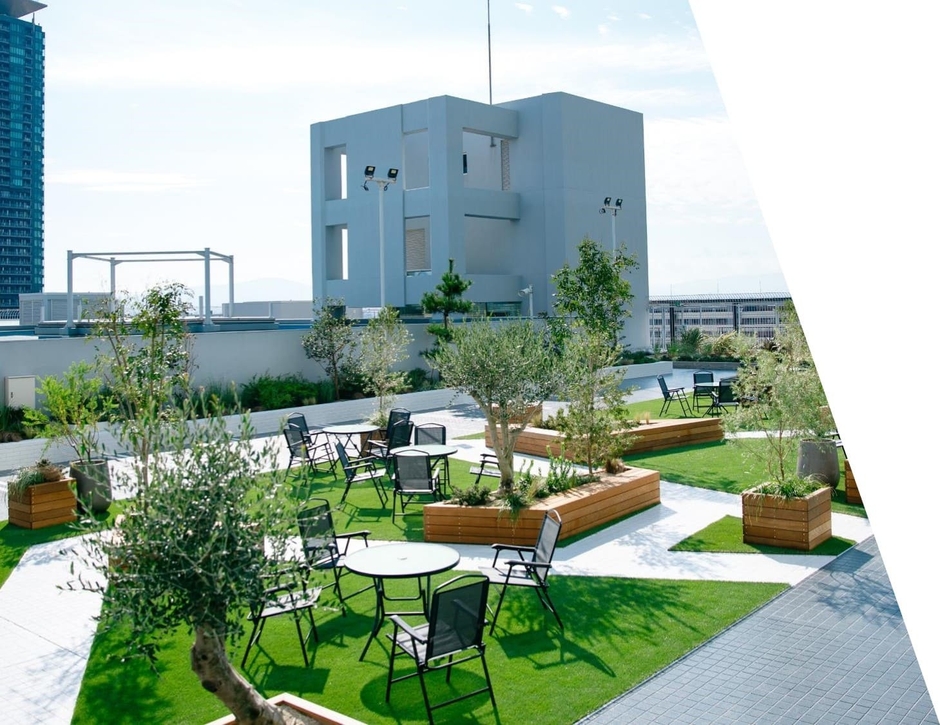 屋上緑化により、お客様に都会にいながら、緑を感じてくつろいでいただける休憩スペースとしてご利用いただいております。