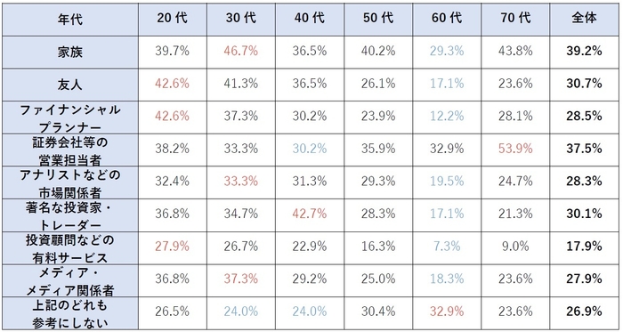 一方の70代では、やはり「証券会社等の営業担当者」の意見を参考とする割合が突出して高い結果となりました。全体平均の37.5%より16.4ポイント高い53.9%となり、全項目で唯一50%を超えました。