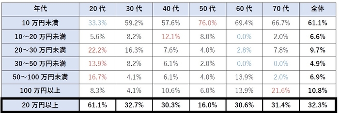 次に、株式投資について学ぶために何らかを購入したことがあると回答した288名を対象に、これまでに学習のために使った金額について質問しました。その結果、20万円以上を使った人の割合は20代が最も高く、61.1%となりました。全体の32.3%を28.8ポイントも上回り、突出して高い結果となっています。
