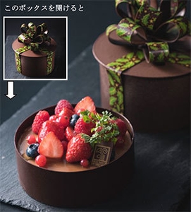 (2)ボックスを開けると、中にはストロベリーやブルーベリー、フランボワーズ、グロゼイユを飾った華やかなケーキが。