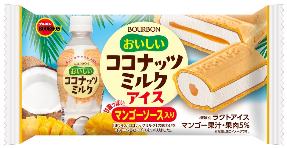 「おいしいココナッツミルクアイス」は、相性の良いココナッツミルクとマンゴーを組み合わせ、さっぱりとした味わいに仕上げたモナカアイスです。アイスクリームにココナッツミルクを加え、ココナッツの風味とコクを引き出しました。また、ひと山ずつの中には甘酸っぱくなめらかなマンゴーソースを充填しました。ご好評をいただいている当社飲料「おいしいココナッツミルク」のすっきりと切れの良いおいしさをイメージしました。四つ割タイプでシェアしてお召しあがりいただけるほか、すっと溶ける口溶けと、ココナッツミルクとマンゴーソースの夏だけのおいしさをお楽しみいただけます。