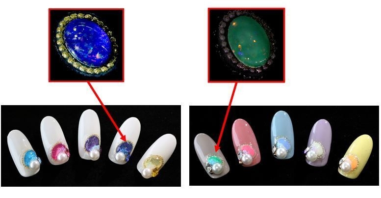 このたびの新商品は、ネイルアート用の装飾品パーツとして、京都オパールに京友禅・西陣織などに使用されているカラー純銀箔を組み合わせ、日本の伝統美を表現した「カラーリーフシリーズ」12色と、暗闇で輝く蓄光材を組み合わせ、色鮮やかな美しさが特長の「蓄光ルミグロウシリーズ」10色の2種類、計22色を展開します。