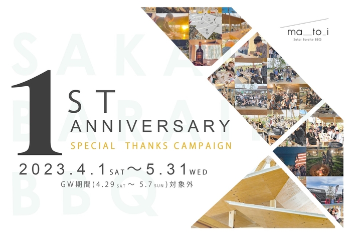 株式会社バーベキューアンドコー(本社:兵庫県明石市松の内2-2、代表:成田收彌)は、大阪府堺市の原池(ばらいけ)公園で運営するBBQ場「堺原池BBQ matoi」が開業1周年を迎えるのに合わせ、4月1日(土)から5月31日(水)までの期間、大型キャンペーンを展開します。期間中に来店すると、BBQ料理やお飲物が最大半額になる謝恩セールを実施するとともに、ママ友の集まりやビジネスマン・学生の打ち合わせなどで気軽に利用していただくため、カフェ感覚の平日限定パックもご用意。さらに、車椅子対応のトイレを店内に新設し、お客様の利便性向上にも取り組んでいます。