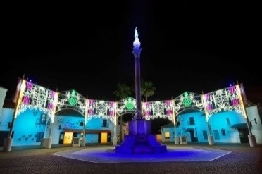 夕日が沈む頃、コロンブス像を主役とした全長35mの大型光ゲートが輝きます。コロンブスへ希望の光を贈ったスペイン初代女王イサベルをテーマに、心の葛藤や、未来への“夢と希望”を表現した光と音のエンターテイメントです。