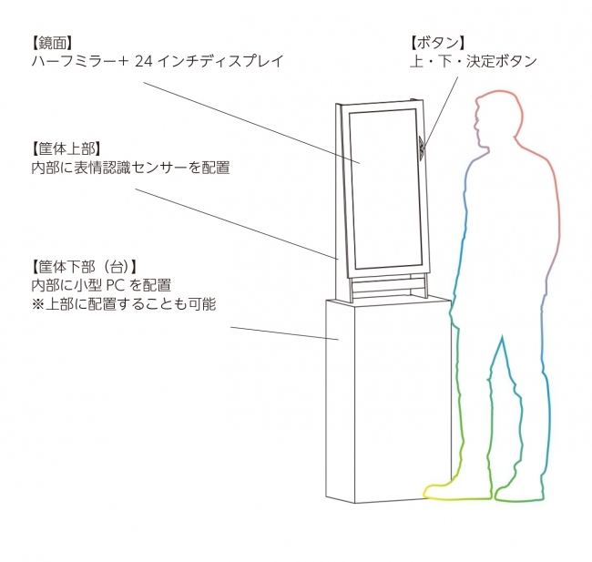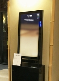 ミラーの前に立った人物の表情・年齢・性別を測定し、その日のラッキースコアを判定してくれます。 さらに判定したデータから商業施設内でのラッキーアイテムを教えてくれます。