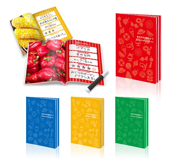 赤・青・黄・緑の4色から好きな色を選び、選んだ「色」を家の中や近所で30種類探して撮影します。その後に本キットを使い、撮った写真をアプリで選ぶと左ページに写真、右ページにアイテムを自動配置。注文して届いたノートに、撮ったモノの情報を書き込めばでき上がりです。