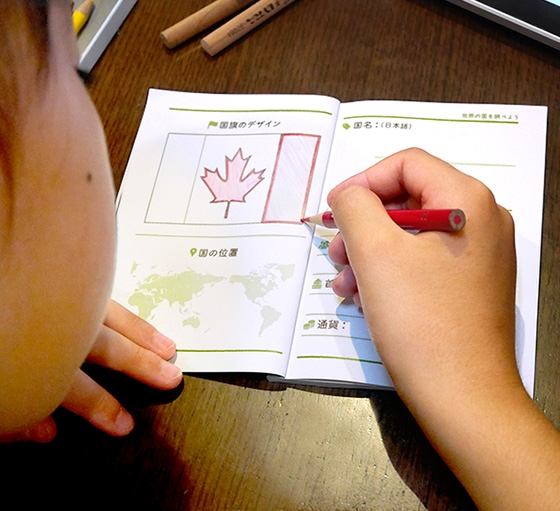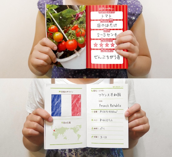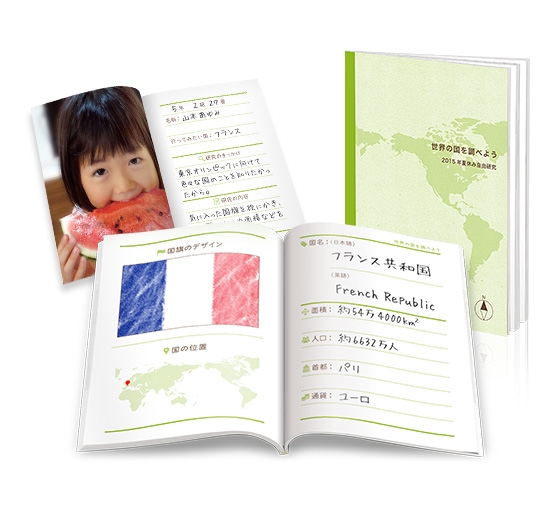 自由研究を行う子供(研究者)の写真を1枚選ぶと、冒頭に簡単なプロフィールが書けるページを自動挿入。注文して自由研究ノートを受け取ってから国旗のデザイン、国名、面積、人口、首都、通貨などを書き込みます。世界地図に国の位置を示すと、立派な研究レポートが完成です。