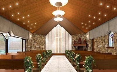祭壇に立体的な壁面を新設。光の十字架を浮かびあがらせる照明を施し、さまざまな空間表現が可能となり、「人前式スタイル」を希望するカップルにも対応可能に。