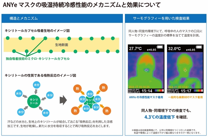 特殊なキシリトール加工を施した生地が、熱を吸収し涼感効果が持続することで、マスク内がムレにくく、熱中症を予防します。(装着時に一瞬だけひんやり冷たくする効果や、ミント等の香りがするものではなく、装着時はキシリトール成分が常に熱を吸収し、通常のマスクよりも快適なマスク内の環境を持続させます)