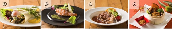茸と木の実のマリネとサラダのクレープ(写真4)/サーモンのグリル(写真5)