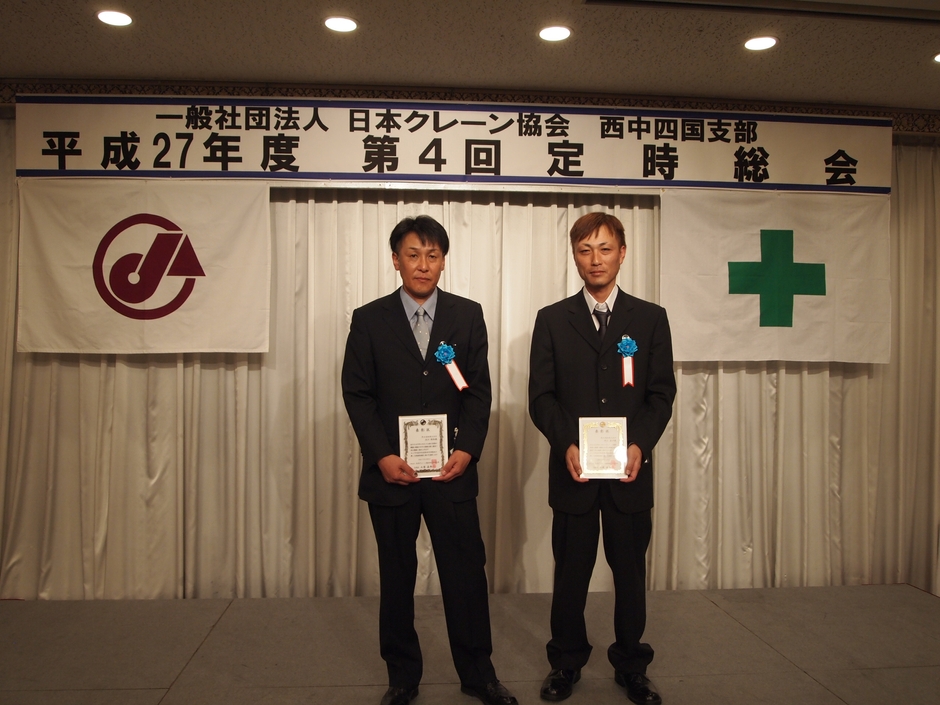 2015年5月20日、日本クレーン協会 西中四国支部主催の「平成27年度 優良クレーン等運転業務従事者等表彰」が広島ダイヤモンドホテルにて行いました。常石造船株式会社(本社: 広島県福山市沼隈町常石1083、代表取締役社長: 河野健二)常石工場の浜川 好和さんが優良玉掛け業務従事者として、村上 真市さんが優良クレーン運転業務従事者として表彰されました。