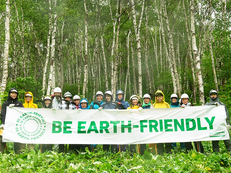 6月30日(日)に、当社の若手社員を中心としたメンバーが「グローブライドの森林」周辺の森林整備を実施しました。当日は早朝から梅雨らしい雨でしたが、仁礼会の指導の下、きれいな白樺が立ち並ぶ森林のふもとから、作業用の長い鎌を使って下草を刈り込み、山の斜面を整備していきました。この斜面の隣には貴重な高山植物が自生する野原が広がり、人が丹念に手入れすることによって「グローブライドの森林」の自然が維持されています。