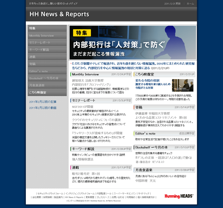 ハミングヘッズ株式会社(本社:東京都中央区、代表取締役社長:大江尚之)は、経営における最重要課題のひとつ「情報発信」活動強化の一環として、2011年2月21日、ハミングヘッズホームページ内に、新しい形のネットメディア「HH News & Reports」サイトをオープンいたしました。