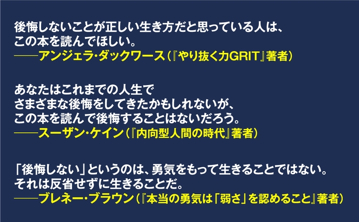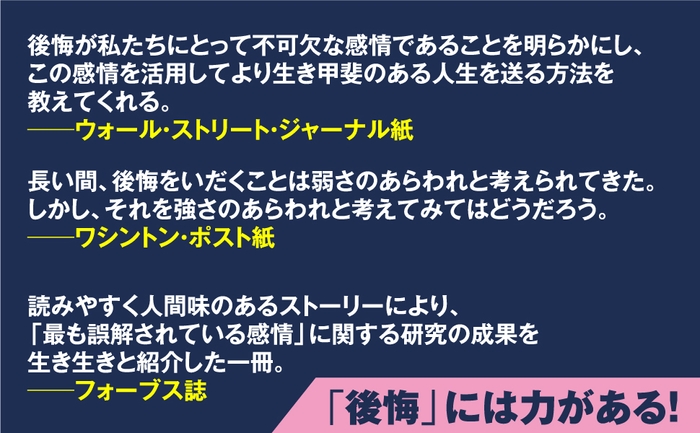 CNN、ニューヨークタイムズ、ウォールストリートジャーナル、フォーブス、フィナンシャルタイムズ、NPR……など、全米のメディアやベストセラー著者が大絶賛した「後悔の力」を再確認する1冊です。