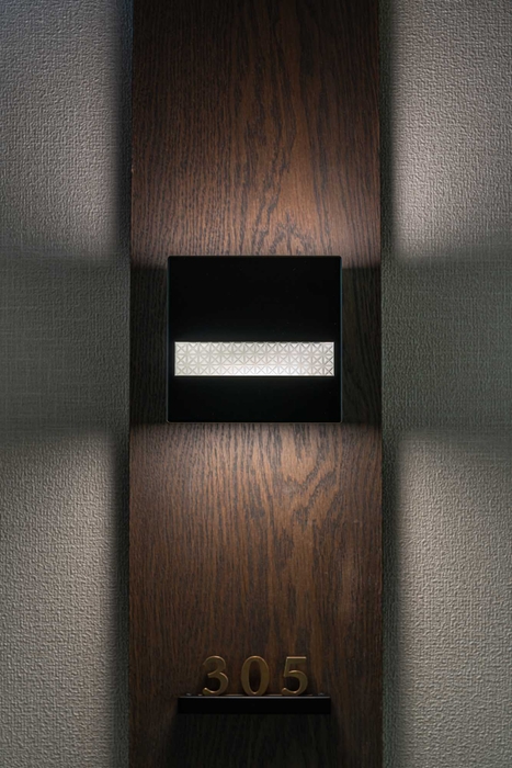 モスグリーンの色合いと、硬くて傷つきにくく、熱にも強い特徴を持つ「萩ガラス」。客室入口のサインにあしらい、やわらかい光で宿泊者を迎えます。