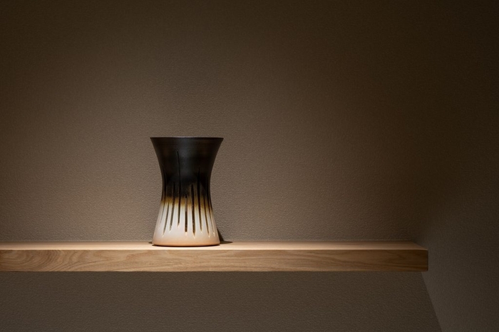 段違いの棚が設置された床の間には、長門湯本温泉からほど近い深川窯の三人の作家(坂倉 正紘氏・田原崇雄氏・坂倉 善右衛門氏)による萩焼の作品を配しています。萩焼は、土の風合いを生かした素朴な作風のものが多く、絵付けなどの装飾はほとんどされないのが一般的です。今回、界 長門の客室やロビーに配するにあたり、萩焼本来のあたたかさを生かしつつ、新しさを感じられる作品にしていただきました。