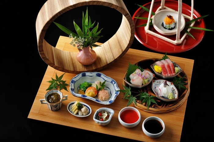 プライベートが保てる半個室の食事処で、地域ならではの旬の食材をいかした会席料理を、意匠を凝らした器とともに楽しめます。山口県はイカの摂取量が全国第二位を誇り、甘みが強く肉厚で柔らかいイカを先付やお造りで提供します。また、酢の物・八寸・お造りを一緒に盛り合わせた華やかな「宝楽盛り」には、萩焼の器と桶を使い、意匠を凝らして仕上げます。桶は、山口県内で唯一の桶職人であり、公益社団法人国土緑化推進機構が定める「森の名手・名人」に選定された坂村 晃氏に製作していただきました。