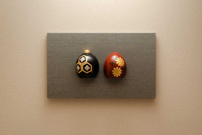 客室に入ってすぐに目につくのは「大内塗」の壁飾り。大内塗は、優雅な絵模様が特徴の山口県の伝統工芸です。夫婦円満の象徴とも言われる対の人形は、美しい漆塗りと金箔を使った「箔絵(はくえ)」が特徴です。