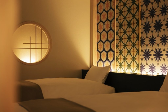 室町時代より800年以上も続き、山口市の無形文化財に指定されている「徳地和紙」をベッドボードに使用。寝台が華やかになるような、色合いに染められた和紙を設えています。徳地和紙は江戸時代、藩の重要な輸出品の一つとして使われていました。現在わずか数戸しか残っておらず、山口市の無形文化財に指定されています。