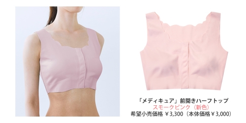 本商品は、患者さまや看護師の方からの「あったらうれしい」のお声から生まれた前開きタイプのハーフトップで、2017年5月から販売を開始しています。前開きデザインなので、乳がん手術後に多い「腕を後ろに回しにくい」「腕が上がりにくい」場合や診察時もスムーズに着脱できます。また、手術後に敏感になりがちなお肌への刺激を軽減するために、首、首元、アンダーバストをきりっぱなしで仕上げ、縫い目によるお肌への刺激を軽減しています。綿65%混のソフトな肌ざわりの素材を採用しやさしい着け心地にもこだわりました。ブラック、シュガーブラウン、グレー杢の3色に加え、「明るい気分になれるピンクがほしい」との患者さまのご要望におこたえし、スモークピンクを新たにラインアップしました。「メディキュア」を通じて、肌着が肌や心をいたわる「衣療」となるようこれからも活動を続けていきます。