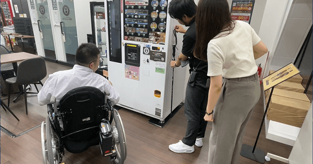 ▼手に麻痺がある方や車椅子利用者が自動販売機を使えるように、店舗にある棒を自動販売機の横に設置