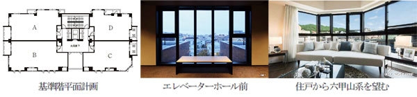 『ジオ神戸本山中町』は、六甲山系の麓、閑静な邸宅街に建つ集合住宅です。邸宅としてのプライバシーを確保するため閉鎖的になりがちな内廊下を「開放感あふれる内廊下」という斬新な発想の下、中央部のエレベーターホールに大きな開口部を設けたことが、平面計画の最大の特長です。また、建物中央部に吹抜けを設けることで、六甲山系の麓という立地ならではの、明るくのびやかな空気感を内部に取り込むとともに、六甲山系に生息する樹々を中心とした植栽計画を行い、建物周辺を行き交う人にも季節の移ろいを感じさせる住まいづくりを実現させました。