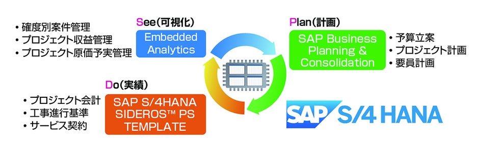 「SIDEROS(TM) PS TEMPLATE」では、基幹業務(販売・購買・生産・会計)とプロジェクト管理(PS:Project System)を一元管理し、案件別に収益管理するための基本機能をSAP Best Practices for S/4HANA (on-premise) Japan Localization, For S/4HANA 1709(※2)をベースにテンプレート化しました。これにより、エンジニアリング・製造業界での案件・物件・研究開発のプロジェクト実行管理および案件別収益管理を早期に実現できます。あわせて、基幹業務とプロジェクト管理を一元化した業務基盤を確立することが可能になります。