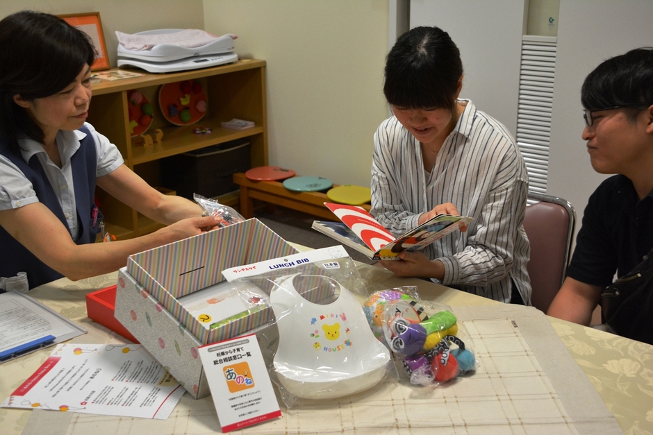 1周年に合わせ、相談窓口「あのね」への来所のきっかけになるよう、出産に対する不安が高まりやすい妊娠後期の妊婦を中心に子育てグッズや絵本などをプレゼントする事業を開始しています。