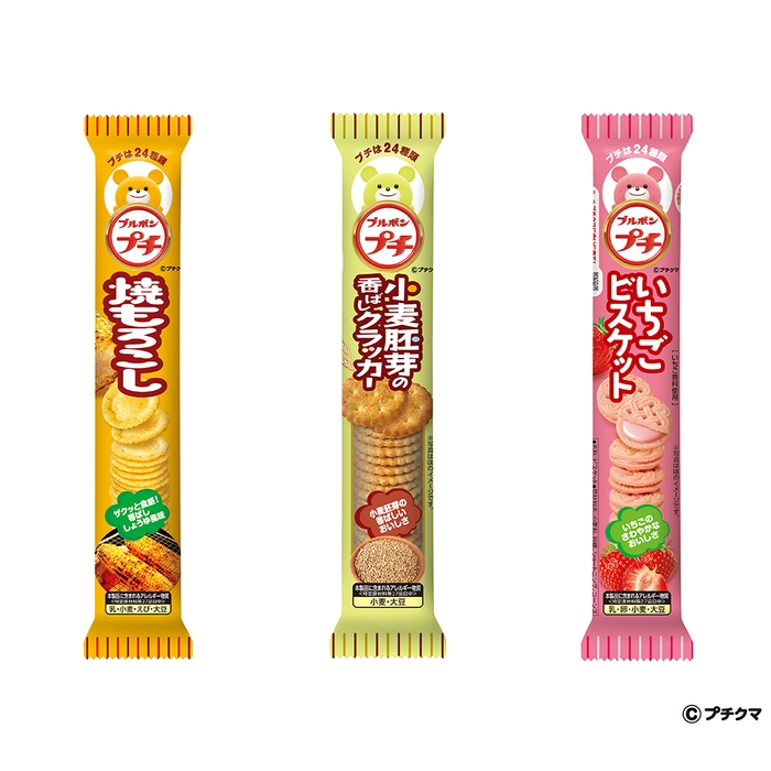 プチポテトうすしお味、プチチョコチップ、プチチョコラングドシャ、プチポテトコンソメ味、プチホワイトチョコラングドシャ、プチえび、プチうす焼、プチチーズ、プチしっとりチョコクッキー、プチ黒ココア、プチチョコチップ抹茶、プチポテトのりしお味、プチえんどうまめうましお味、プチフランスバターのクッキー、プチ濃いきなこウエハース、プチシナモンビスケット、プチあげ丸味わいしょうゆ味、プチこざかなせん、プチもち麦ごません、プチチョコサンド、プチトマトプレッツェル、プチいちごビスケット、プチ焼もろこし、プチ小麦胚芽の香ばしクラッカー