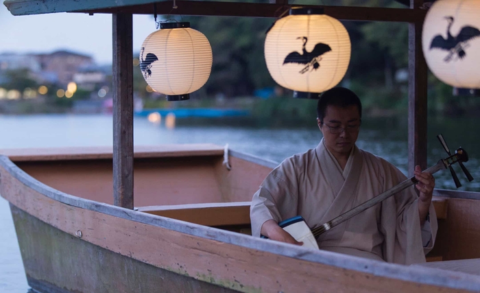 一般の鵜飼鑑賞船は乗り合いですが、本アクティビティの船は一日一組限定の貸し切り船です。クッションやキャンドルを設えたプライベートな空間でゆっくりと食事や鵜飼鑑賞を楽しむことができます。参加者は星のや京都の前から船に乗り、15分程かけて鵜飼が開催される下流へ向かいます。その間、船の上で行われるのは三味線の生演奏です。日中は観光客で賑わう大堰川ですが、夜になると静かになり、三味線の音色が暮れゆく奥嵐山の渓谷にこだまします。三味線を聞きながらの船遊びは星のや京都の鵜飼鑑賞船だけの特別な夏の過ごし方です。