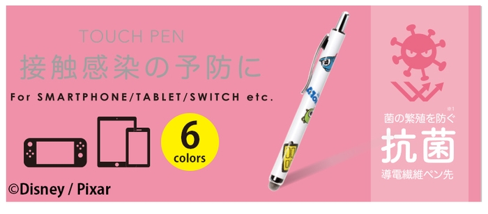ディズニーキャラクターデザインのスマートフォンやタブレット、ATMやエレベーター等日常生活の様々なタッチ操作を指で触れずに行えるノック式タッチペンです。ペン先は菌の繁殖を防ぐ抗菌仕様。また、導電繊維を使用しているのでイラストや文字を書く際には滑りの良い、サラサラとした書き心地を楽しめます。ノック式仕様でペン先の劣化を防ぎ、片手で簡単収納が可能です。胸元のポケットや小さなショルダーバッグに入れて持ち運びにも便利な太さ9mmのコンパクトサイズ。