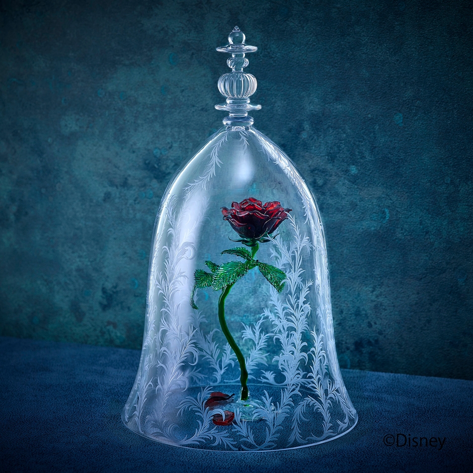 「la rose」は、映画に登場する「魔法のバラ」のデザインを忠実にガラスで再現したオリジナルのフラワーオブジェです。ガラス製のドーム、リーフ模様のカッティングデザイン、まるで魔法で浮いているように、映画のイメージを残しつつ、「自然な植物の表情や花色」に近づけたガラス製のバラなど、細部にこわだわってデザインしています。