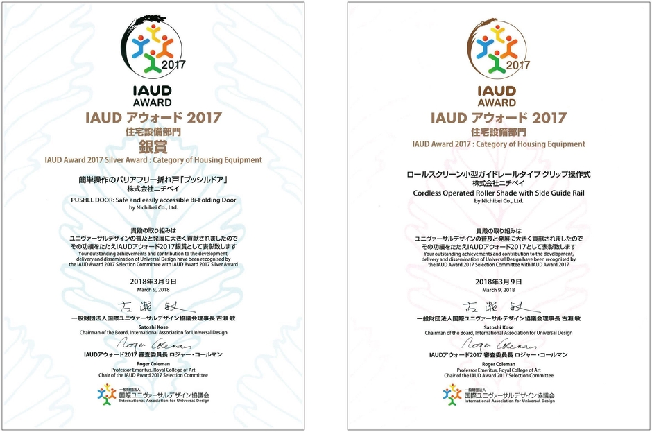 株式会社ニチベイ(本社:東京都中央区、社長:福岡 勇之輔)は、一般財団法人 国際ユニヴァーサルデザイン協議会(IAUD)が主催するIAUDアウォード2017にて、ユニヴァーサルデザインドア「プッシルドア」「プッシルドアライト」が銀賞を受賞、さらに高遮光ロールスクリーン「ソフィー」小型ガイドレールタイプ グリップ式もIAUDアウォードを受賞いたしました。