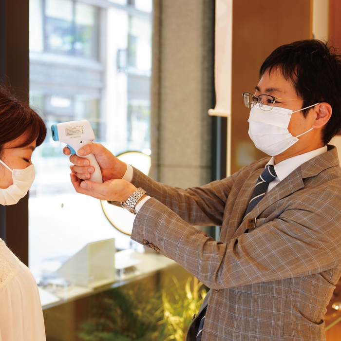 当店ではお客様のご来店の際にマスク着用のうえ、手指の消毒と体温測定をお願いしております。(非接触型体温計をご用意しています。)