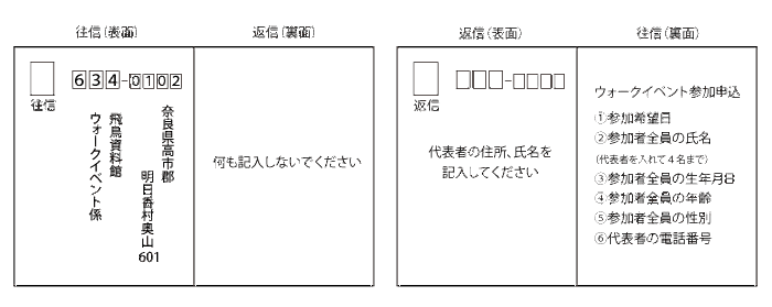 送付先 〒634-0102奈良県高市郡明日香村奥山601 飛鳥資料館ウォークイベント係