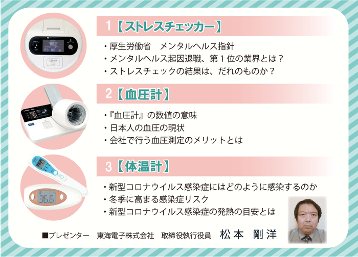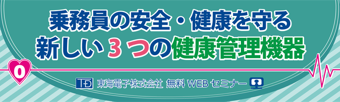 点呼機器およびアルコール検知器を開発・販売する東海電子株式会社(本社:静岡県富士市 代表:杉本 哲也)は、 この度、 「乗務員の安全・健康を守る新しい3つの健康管理機器」無料オンラインセミナーを開催いたします。