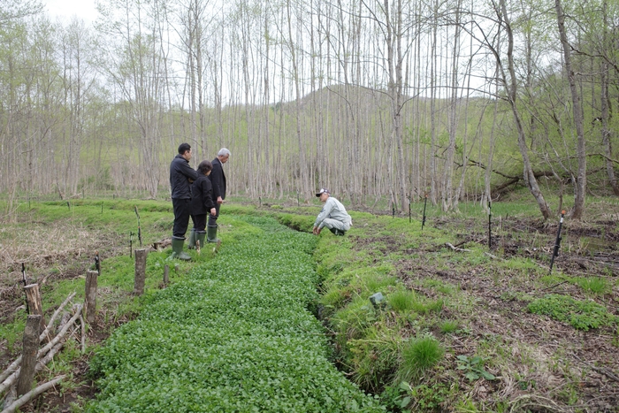 2025年4月22日、料理長たちは「新川クレソン」の生育環境や味の特徴を学ぶため、宿から車で10分ほど、ニッカウヰスキー宮城峡蒸留所すぐそばに位置する、新川地区(仙台市青葉区)を訪ねました。