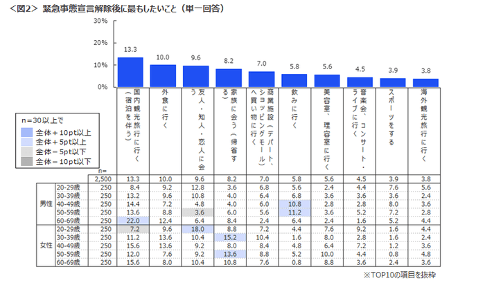 【最もしたいこと(単一回答)】としては、「宿泊を伴う国内旅行」がトップに。中でも特に、年齢が高い人ほど旅行に行きたい気持ちが高く、これから緊急事態宣言の解除が進むと、より旅行の需要が高まっていくと推測される。一方、20代女性では「友人・知人・恋人に会う」、30代、50代女性では「家族に会う」など、女性は比較的他者とのコミュニケーションに関する項目が高い傾向にある。 <図2>