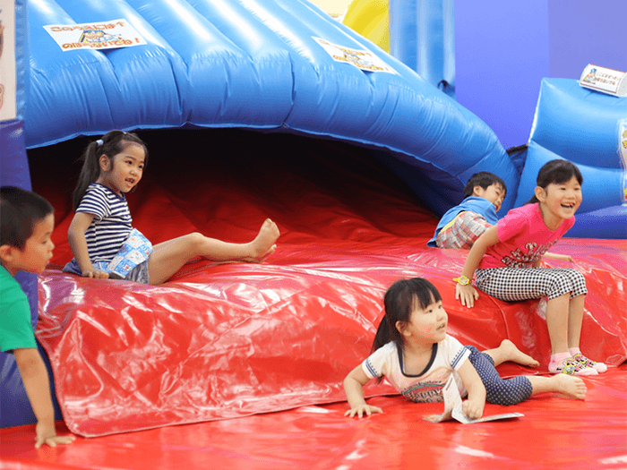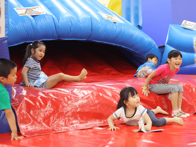 ふわふわエリアは、遊具管理をはじめ、安心・安全を徹底していますので、子どもたちが気兼ねなく体を思いっきり動かすことができます。何より身体機能の促進、ストレスの解消など様々な視点から遊びながらの体力づくりを体感できます。