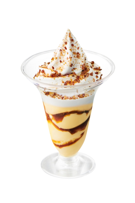 なめらかプリン、カラメルソースの苦み、ローストシュガーの香りとバニラソフト がバランスよく、パフェとしての一体感を生み出します。