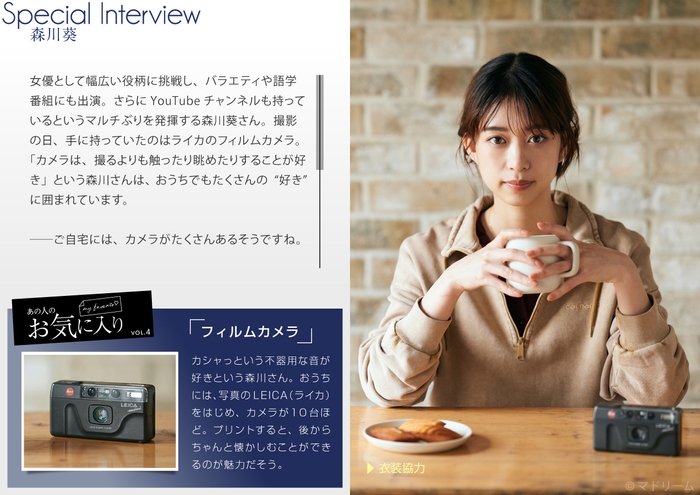 最新号には、森川葵さんが登場。ご自身のYouTubeチャンネルは自宅から配信しているという、好きなものがたくさん詰まったおうちのお話や、趣味だという編み物やカメラについてお話をしていただきました。撮影現場には、ご自身のライカのカメラを持参。カメラを構えて、「カシャっというフィルム独特の音が好き」と語ってくれました。
