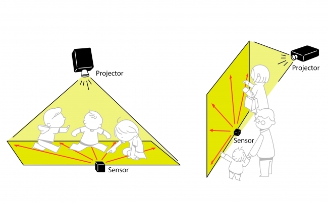 プロジェクターで投影可能なあらゆる面を、測域センサ(※1)を用いてインタラクティブコンテンツに変化させます。